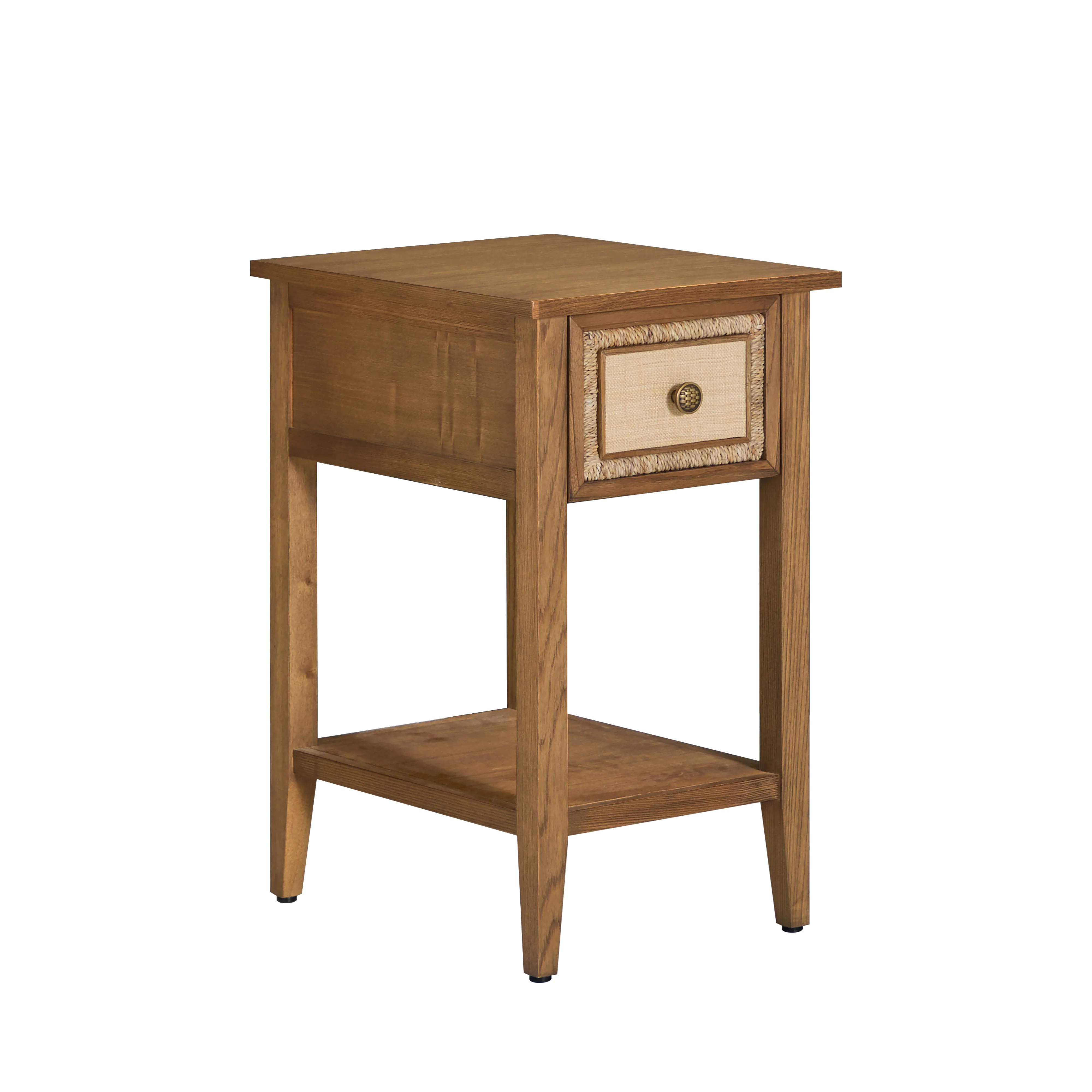 - Raffia-inspired drawer fronts add natural texture.