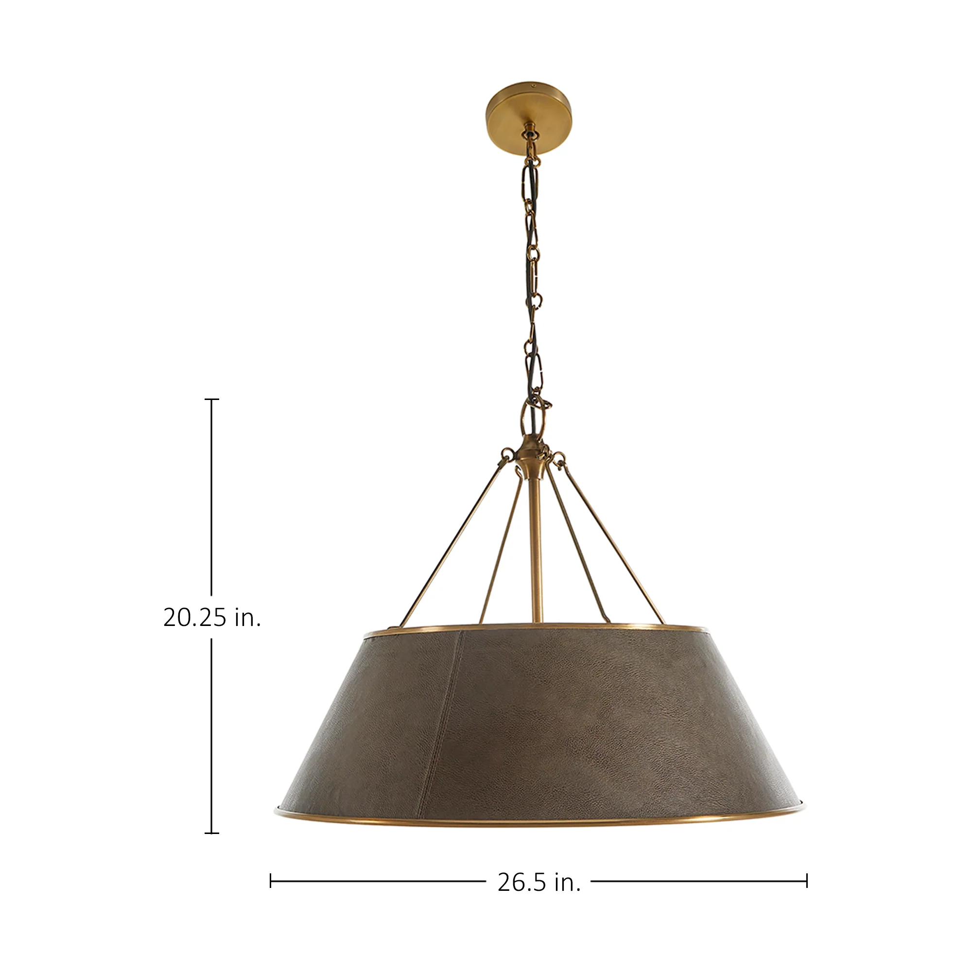 - Brushed antique bronze frame and dark leather wrapped shade offer a rich mix of texture and timeless craftsmanship